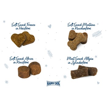 Mit dem Happy Dog Adventskalender kannst du deinem Hund die Vorweihnachtszeit verschönern und zugleich für Weihnachtsstimmung sorgen. Ebenso wie wir Menschen freuen sich auch unsere Vierbeiner über kleine Überraschungen in der Adventszeit. Hinter den 24 Türchen verstecken sich köstliche, getreidefreie Snacks in vier verschiedenen Formen und Geschmacksrichtungen und verwöhnen deinen vierbeinigen Liebling jeden Tag auf´s Neue. So wird die Weihnachtszeit auch für deine Fellnase zur schönsten Zeit des Jahres!