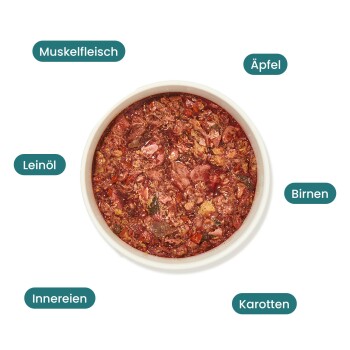 Unsere Mischung enthält Pferdefleisch, -lunge, -fett, -magen, -brustbeinknorpel, -herz, -leber sowie Karotten, Äpfel und Birnen. Abgerundet wird die Mischung mit Leinöl (reich an Omega-3-Fettsäuren). Außerdem enthält unser Produkt Leinsamen, LBT-Hefe, Algen, Brennesselkraut, Birkenblatt, Mariendistelkraut und Löwenzahn. Die Pferdebrustbeinknorpel als natürliche Kalziumquellen tragen zu einem gewünschten Kalzium-Phosphor-Verhältnis bei. (Bitte beachten Sie, dass sich das Kalzium-Phosphor-Verhältnis ändert, wenn Sie Getreide zufüttern.)