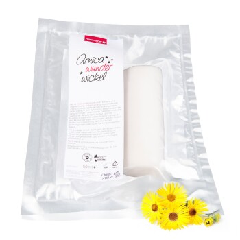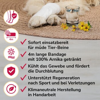 Der Arnikawunderwickel ist die sofort griffbereite schnelle Unterstützung für müde Pferde- Hunde- und Katzenbeine. Die Bandage ist mit 100% Arnika getränkt – jederzeit schnell einsatzbereit, um die Regeneration zu unterstützen. Auch bei stumpfen Verletzungen anwendbar: zum Beispiel ein Bluterguss, eine Verstauchung, Prellung oder Quetschung. Arnika kühlt das Gewebe und fördert die Durchblutung. Dadurch wird die Heilung unterstützt und der Stoffwechsel verbessert. Interessantes: Arnika ist eine widerstandsfähige und robuste Pflanze, die im Gebirge wächst und dort Wetter, Stürmen und widrigen Bedingungen trotzt. Sie ist seit dem 18. Jahrhundert als nützliche Heilpflanze bekannt. Arnika wird traditionell gegen Schwellungen, Prellungen, Entzündungen, Gelenkschmerzen, Verspannungen und Arthrose eingesetzt. Eine Studie an Sportlern fand Hinweise darauf, dass die äußerliche Anwendung von Arnika Muskelkater vermindern kann. Der Arnikapflanze werden entzündungshemmende, schmerzlindernde und antibakterielle Effekte nachgesagt. Sie enthält rund 150 wirksame Inhaltsstoffe – zum Beispiel sekundäre Pflanzenstoffe wie Flavonoide, Sesquiterpenlactone, Carotinoide, Cumarine und ätherische Öle. Im Arnikawunderwickel steckt die volle Pflanzenkraft der Arnika in hochkonzentrierter Form. Alkohol konserviert den hohen Wirkstoffgehalt auf natürliche Art. Gleichzeitig wirkt er kühlend und verbessert die Durchblutung. Tiroler Quellwasser stammt aus den Tiefen der Alpen und muss durch viele Gesteinsschichten fließen, bis es an die Oberfläche kommt. Dadurch wird es mehrfach gefiltert und mit wichtigen Mineralien angereichert. Weil es so lange in Quellschutzgebieten durch den Berg fließt, kann das Wachstum von Keimen ganz natürlich verhindert werden. Das Tiroler Quellwasser versorgt die Haut mit wertvoller Feuchtigkeit. Der Arnikawunderwickel ist 4m lang und kann einfach passend mit einer Schere zugeschnitten werden. Zur mehrfachen Verwendung tränken Sie ihn mit Arnikawunder. Die Bandage wird um das Bein gewickelt und durch Umschlagen und Einstecken fixiert – alternativ können Sie zur Befestigung auch eine Überbandage anlegen oder ein Tape benutzen. Wickle den kompletten Arnikawickel wie eine Bandage um das Bein oder jede andere zu versorgende Stelle - zur schnelleren Erholung nach dem Sport , zur Vorbeugung von Muskelkater oder zur Erfrischung im Sommer hilfreich. Tipp: Bewahren Sie den Arnikawunderwickel im Kühlschrank auf, so haben Sie ihn bei Bedarf schnell parat, und die gekühlte Bandage wirkt doppelt erfrischend. Die klimaneutrale Herstellung ist uns sehr wichtig – in Handarbeit und mit viel Liebe . Hinweise: Zum äußerlichen Gebrauch Nicht bei bekannter Überempfindlichkeit gegen Arnika anwenden. Bitte beachten Sie beim Pferd eine Karenzzeit von 48 Stunden (gemäß FN-ADMR). Maße 4 m