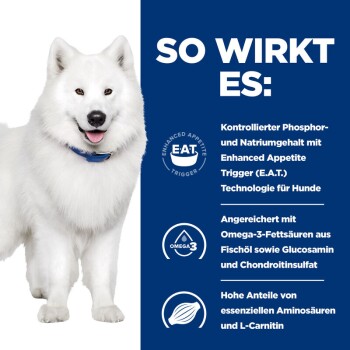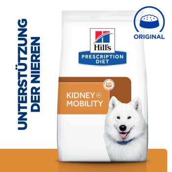 Hill's Prescription Diet k/d + Mobility Trockenfutter für Hunde wurde speziell entwickelt, um die Nieren- und Gelenkgesundheit deines Hundes zu unterstützen. Diese klinische Ernährung ist der Schlüssel, um sicherzustellen, dass dein vierbeiniger Freund in Bestform bleibt.Mit dieser einzigartigen Kombination von Prescription Diet k/d zur Unterstützung der Nieren und Prescription Diet j/d zur Förderung der Beweglichkeit bietet dieses Trockenfutter die perfekte Lösung. Es regt den Appetit deines Hundes an, verbessert die Futteraufnahme und schützt die lebenswichtige Nierenfunktion. Innerhalb von nur 21 Tagen kann die Fähigkeit zu rennen, zu gehen und zu springen spürbar gesteigert werden, und deinen geliebten Hund wird wieder lebhafter sein.Nicht nur die Wissenschaft, sondern auch unsere tierärztliche Expertise steckt hinter diesem hochwertigen Futter. Wir setzen auf eine proaktive Herangehensweise, bei der die Ernährung eine entscheidende Rolle spielt. Damit dein Hund ein gesundes und ausgewogenes Leben haben kann.