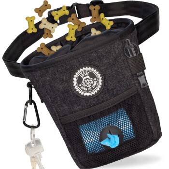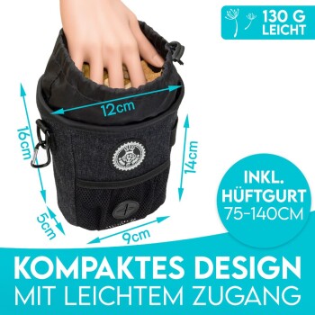 Die HUND IST KÖNIG Leckerchentasche – Kompaktes Design & Funktionalität in einem Erleben Sie das Gassigehen und Hundetraining auf eine völlig neue Art und Weise mit der HUND IST KÖNIG Hunde Leckerlie Tasche im angesagten Denim Jeans-Look. Dieser kompakte Hunde Leckerlie Beutel wurde speziell für Hundeliebhaber wie Sie entwickelt, die nicht nur Wert auf Funktionalität, sondern auch auf Stil legen. Schnelle Belohnung, positive Verstärkung: Der Hauptzweck unserer Hunde Trainingstasche ist es, Leckerlis für Ihren Hund immer griffbereit zu haben. Das großzügige mittlere Fach mit Kordelzug-Verschluss ermöglicht Ihnen, Ihren Hund in Sekundenschnelle zu belohnen. So wird positives Verhalten effektiv verstärkt. Alles in einem: Dieser vielseitige Hunde Leckerlibeutel bietet nicht nur Platz für Leckerlis, sondern auch für Hundezubehör wie eine Hundepfeife und einen Clicker. Zudem finden Bargeld, Kreditkarten oder Schlüssel im kleinen Reißverschlussfach an der Rückseite der Futterbeutel Tasche ihren sicheren Platz. Die Vorteile im Überblick Einfache Futterentnahme: Dank eines schrägen und stabilisierten Futterzugangs mit einem Durchmesser von 12 cm gestaltet sich die Futterentnahme spielend leicht. Vielseitige Tragemöglichkeiten: Im Lieferumfang ist ein Hüftgurt enthalten, der sich zwischen 70-140 cm in der Länge verstellen lässt. Zusätzlich verfügt die Hunde Futtertasche über zwei Gürtelschlaufen an der Rückseite, durch die Sie ihn bequem am Hosengürtel befestigen können. Ein stabiler Gürtelclip aus Metall sorgt für zusätzliche Flexibilität, damit Sie die Hunde Leckerli Tasche nach Ihrem persönlichen Stil tragen können. Höchste Qualität: Die Fächer der Futtertasche für Hunde bestehen aus lebensmittelechtem Polyestergewebe und erfüllen die strengen Standards des Deutschen Lebensmittel- und Futtermittel Gesetzbuchs. So können Sie bedenkenlos aus unserem Leckerli Beutel füttern, ohne sich Sorgen machen zu müssen. Robust und langlebig: Wir wissen, dass das Leben mit Ihrem Hund aktiv sein kann. Daher haben wir unseren HUND IST KÖNIG Futterbeutel besonders robust und langlebig gestaltet, um allen Anforderungen gerecht zu werden. Leichte Reinigung: Das Innenfutter unserer Hundefuttertasche lässt sich komplett herausziehen (auf Links drehen), um es mühelos zu reinigen. Alternativ können Sie die gesamte Hunde Leckerlietasche einfach in der Waschmaschine bei 30°C waschen. Integrierter Kotbeutelspender: An der Vorderseite unserer Leckerchentasche für Hunde befindet sich ein praktisches Netzfach mit integriertem Kotbeutelspender, um Ihnen das Gassigehen noch angenehmer zu gestalten. Für jeden Hundeliebhaber: Unser Tasche für Hundetraining & Gassi ist die perfekte Wahl für alle Hundebesitzer, egal ob Sie Anfänger sind oder bereits ein erfahrener Hundetrainer. Er wurde entwickelt, um die Bedürfnisse aller Hundefreunde zu erfüllen. Technische Details im Überblick: Maße Futterbeutel: 16 cm x 12 cm x 5 cm (HxBxT) Länge Bauchgurt: ca. 75-140 cm Breite Bauchgurt: 2,5 cm Farbe: Schwarz Gewicht Futterbeutel: 134 g Gewicht Bauchgurt: 45 g Material: Außen: Strapazierfähiger Denim Jeans-Stoff aus 90% Baumwolle & 10% Polyester Innen: Leicht abwaschbares Polyester-Gewebe Verschlüsse und Zubehör: Hochwertige Eisenkomponenten, zum Teil oberflächenbehandelt Waschmaschinengeeignet: bis 30°C Mit der HUND IST KÖNIG Snack Tasche im Denim Jeans-Look setzen Sie nicht nur ein modisches Statement, sondern haben auch alles, was Sie für ein entspanntes Gassigehen und erfolgreiches Hundetraining benötigen, immer griffbereit. Bestellen Sie noch heute und erleben Sie die Verbindung von Stil und Funktionalität. HUND IST KÖNIG - Ihr Begleiter für ein königliches Hundeleben!