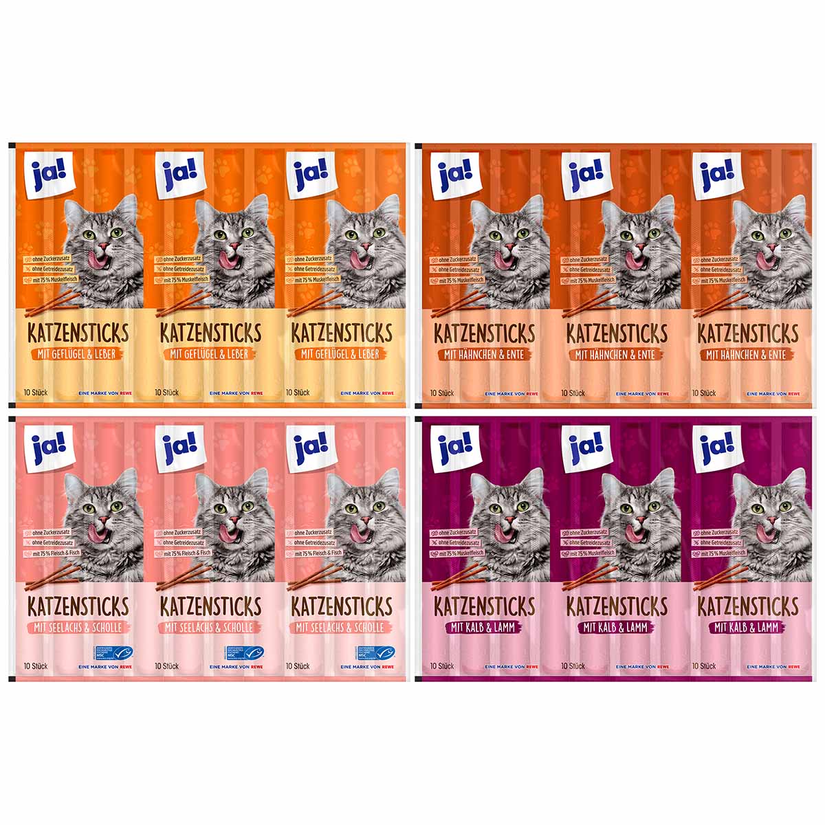 Schmackhafte Katzensticks von ja! In vier verschiedenen Sorten. ohne Getreide- und Zuckerzusatz.