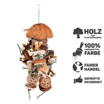 Die pure Entdeckungsreise für Ihren gefiederten Liebling durch den Materialmix aus: Kokusnuß, Muscheln, Balsaholz, Kaffeeholz und Bambublatt-Tasche Das ideale Spielzeug für mittlere Papageien aber auch Aras & Kakadus finden es spannend. Mutige kleine Freunde mit viel Platz in Ihrem Vogelheim finden auch gefallen an dem bunten Materialmix. Größe: ca. 60 x 35 cm Geeignet für: - alle Großsittiche & Papageien