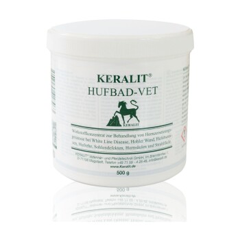 Das Keralit Hufbad-Vet ist ein hochwirksames Konzentrat, das speziell zur Stabilisierung und Regeneration von geschädigtem Hufhorn entwickelt wurde.Es stärkt die Hufwand, Sohle, den Strahl und die Weiße Linie und bietet eine effektive Lösung bei Hornschädigungen, die durch Zersetzungsprozesse beeinträchtigt sind. Besonders bei stark geschädigtem Horn kann das Hufbad die geschwächten Bereiche stabilisieren und weiteres gesundes Horn schützen, oft ohne die Notwendigkeit großflächiger Hornentfernung durch den Tierarzt oder Hufschmied.Die Behandlung mit dem Keralit Hufbad wirkt sowohl präventiv als auch regenerierend, indem es auch unsichtbar geschädigte Bereiche stabilisiert und eine weitere Zersetzung verhindert. Für eine gebrauchsfertige Lösung wird das Konzentrat im Verhältnis 5 % in Wasser gelöst (5 g Konzentrat pro 100 ml Wasser). Die Menge des Hufbades richtet sich nach der Behältergröße, sodass die geschädigten Bereiche des Hufs vollständig unter dem Flüssigkeitspegel sind.SicherheitshinweiseKeine Behandlung bei offenliegenden Hufverletzungen - Hier ist der Tierarzt zu konsultieren. Das Hufbad ist KEIN Futtermittel.P302+P352BEI BERÜHRUNG MIT DER HAUT: Mit viel Wasser und Seife waschen.P305+P351+P338BEI KONTAKT MIT DEN AUGEN: Einige Minuten lang behutsam mit Wasser ausspülen.Eventuell vorhandene Kontaktlinsen nach Möglichkeit entfernen. Weiter spülen.UFI Code: TF00-Q08K-8001-4CA6. Notruf: +49 (0)30 30686700