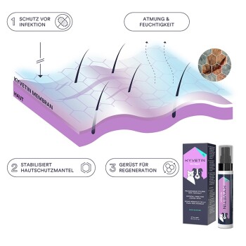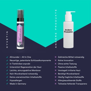 SOFORTHILFE AUF GRUNDLAGE DER NATUR: Kyvetin Skin Repair Gel hilft sofort bei schlecht heilenden und zur Nachpflege von Wunden, übermäßigem Lecken, juckenden Stellen, Stichen und Bissen (z.B. Wespen, Grasmilben), Ekzemen, rissigen Ballen und Hautreizungen. Kyvetin enthält keine unerwünschten Zusatzstoffe. Made in Germany. PFLEGT UND SCHÜTZT: Kyvetin Gel legt sich als atmungsaktive Membran auf die betroffene Hautstelle. Schon nach der ersten Anwendung werden oberflächliches Schmerzempfinden und Juckreiz reduziert. Die Besiedlung mit schädlichen Mikroorganismen wird unterbunden. BESCHLEUNIGT HAUT-REGENERATION: Die Kyvetin-Membran stärkt die Selbstheilungskraft der Haut und stärkt die Gewebe-Regeneration bei Hunden und Katzen. PATENTIERTE SCHLÜSSELKOMPONENTE: Die Grundlage von Kyvetin ist der natürliche Wirkstoff Chitosan, der viele Lebewesen erfolgreich bei oberflächigen Verletzungen schützt. Diese Errungenschaft der Natur ist in Kyvetin als patentiertes Chitosan-FH02® für Haustiere optimiert. PUNKTGENAUE DOSIERUNG: Kyvetin Gel eignet sich perfekt zur punktgenauen Behandlung von kleineren Stellen. Durch die höhere Wirkstoff-Konzentration je Tropfen können Sie Ihren vierbeinigen Liebling gezielt und effektiv behandeln. Sehr dünn auftragen. Hoch-effektiv. Weitere Informationen erhalten Sie hier: Tel.: +49 6131 3274855 Email: info@kyvetin.com