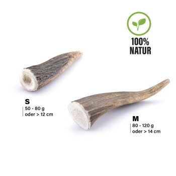 Zahnpflege ist wichtig! In der Natur reinigen Tiere ihre Zähne auf völlig natürliche Weise, z. durch Kauen von Knochen. Heutzutage erhält der Hund eine große Anzahl von Nährstoffen durch das Futter, aber die Zahnreinigung fehlt hier völlig. Was ist mehr ein Ersatz als ein ganz natürliches Kauen, das auch unsere Hunde lieben? Larsson SnacksGeweihstücke sind hier die ideale Zahnpflege! Geweih besteht aus wertvollen Mineralien und Spurenelementen wie Eisen, Phosphor, Schwefel, Kalzium, Magnesium, Kalium und Zink (um nur einige zu nennen) und diese auch in einem optimalen Verhältnis. Der jeweilige Gehalt dieser Nährstoffe hängt vom Lebensraum der Tiere sowie von den Wetterbedingungen und Essgewohnheiten der Tiere ab. Das einmalige Abwerfen desGeweihs pro Jahr macht sie im wahrsten Sinne des Wortes zu einem nachwachsenden Rohstoff. Kein Tier wird dafür getötet, sondern versorgt uns freiwillig mit diesem großartigen Rohstoff. Um den natürlichen Lebensraum der Tiere nicht zu zerstören und sie nicht unnötigen Belastungen durch Motorgeräusche auszusetzen, werden sie ausschließlich zu Fuß und von Hand gesammelt. Hier zählt jeder Tag! Je frischer dasGeweih, desto mehr Nährstoffe können bei der Weiterverarbeitung gewonnen werden. -Geweihe sind sehr hart und reich an Kalzium und anderen Mineralien - Unser Snack reinigt und pflegt die Zähne Ihres Hundes auf natürliche Weise und ist 100% reine Natur Hinweis: Stellen Sie sicher, dass die Größe, die Sie kaufen, der Größe und der Bisskraft Ihres Hundes entspricht. Beaufsichtigen Sie bitte Ihren Hund während des Kauens und entfernen Sie gegebenenfalls kleine Reststücke.
