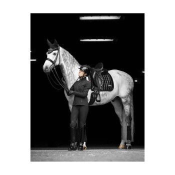 Entdecke die Eleganz und den Luxus der Dressurschabracke Loire Classic Square von LeMieux.Diese Schabracke ist mehr als nur ein gewöhnliches Sattelpad – der gewebte Satin-Oberstoff verleiht ihr einen edlen Schimmer, während das atmungsaktive Bambusfutter für optimalen Tragekomfort sorgt. Das 100 % natürliche Bambusmaterial reguliert Wärme und Schweiß deines Pferdes und bietet eine zuverlässige Feuchtigkeitsaufnahme.Ein weiteres Highlight ist die weiche, reibungsfreie Wildleder-Einfassung, die die Kanten des Pads sanft umschließt und hilft, die perfekte Form zu bewahren. Im Gurtbereich findet sich ein texturierter PU-Lederbereich mit einem geprägten Logo, ergänzt durch das charakteristische Untergurtband von LeMieux mit inneren Verriegelungsschlaufen. Ein besonderes Detail ist das metallene Logo auf einer Lederbefestigung im Flankenbereich, das dieser Schabracke einen exklusiven Touch verleiht.