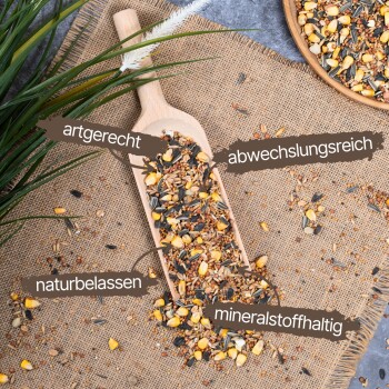 Entdecken Sie unser nährstoffreiches Allzweck-Mix Streufutter aus der Alb-Mühle, das sich durch traditionelle Verarbeitung auszeichnet. Mit dem besonderen Herstellungsverfahren und den natürlichen Zutaten erhalten Ihre Wildvögel eine wertvolle Quelle für Fette, Proteine, Kohlenhydrate, Vitamine und Mineralstoffe. Dies unterstützt eine natürliche und ausgewogene Ernährung der Vögel und trägt zu deren Vitalität bei. Beste Zutaten: Mit unserer sorgfältigen Auswahl hochwertiger Inhaltsstoffe wie schwarze Sonnenblumenkerne, Mais, Hirse, Hafer, Weizenflocken und Erdnusskerne, garantieren wir eine ausgewogene und nahrhafte Mahlzeit für Ihre gefiederten Besucher. Ganzjährige Fütterung: Unser schmackhaftes Streufutter bietet die Möglichkeit zur Ganzjahresfütterung von Wildvögeln. Es erfüllt die Bedürfnisse der Vögel unabhängig von der Jahreszeit und den jeweiligen Wetterbedingungen. Ob im Sommer, um Wildvögel bei der Aufzucht ihrer Jungen zu helfen, oder im Winter, um Vögeln eine zusätzliche Nahrungsquelle in kalten Zeiten zu bieten, unser Allzweck-Mix aus der Alb-Mühle ist das ganze Jahr über ideal geeignet. Optimal für Garten und Terrasse: Für eine optimale Streufuttergabe sollten Sie geschützte Futterstellen auswählen. Einfach das hochwertige Streufutter in Vogelhäuser oder Futterspender füllen und die lebhaften Besucher begrüßen. Um die Qualität zu bewahren, lagern Sie das Alb-Mühle Streufutter kühl und trocken. Das gelieferte Futter kann in Farbe und Form aufgrund der natürlichen Beschaffenheit variieren. Abgebildete Dekorationsartikel gehören nicht zum Lieferumfang.
