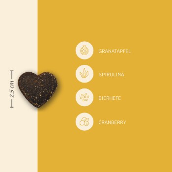 Diese Snacks sind ein echter Vitamin-Kick für immunstarke Hunde: Mit natürlichen Mikronährstoffen, den Vitaminen C und E sowie Zink unterstützen sie den Vitalstoffaufbau und viele Reparaturvorgänge im Körper des Hundes. Von Tierärzten entwickelt und unwiderstehlich lecker!