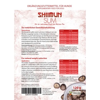 Shiimun Slim - natürliches Diätpulver für schlanke und vitale Hunde Übergewicht ist bei Hunden leider weit verbreitet. Es ist daher sehr wichtig, dass Sie zeitnah dafür sorgen, dass Ihr Hund abnimmt und wieder sein Normalgewicht erreicht. Um Sie dabei zu unterstützen, haben wir mit Shiimun Slim ein gut bekömmliches Diätpulver aus natürlichen Zutaten entwickelt. Übergewicht beim Hund und seine Folgen Ist ein Hund zu dick, führt das nicht nur zu einer deutlich schlechteren Lebensqualität, sondern darüber hinaus in vielen Fällen auch zu einer geringeren Lebenserwartung. Um Ihrem Vierbeiner all das zu ersparen, ist eine durchdachte Diät mit einem gesunden Hundefutter und geeigneten Nahrungsergänzungen wie Shiimun Slim unverzichtbar. Warum sich Shiimun Slim ideal als Unterstützung bei der Diät eignet Bei der Entwicklung unserer Produkte legen wir seit jeher großen Wert auf eine hohe Qualität und eine gute Verträglichkeit der von uns genutzten Zutaten. Das gilt selbstverständlich auch für unser Diätpulver Shiimun Slim. Die perfekt abgestimmte Zusammensetzung aus sorgfältig ausgewählten natürlichen Inhaltsstoffen macht Shiimun Slim zum idealen Begleiter der Diät Ihres Hundes. Flohsamenschalen (50%) Flohsamenschalen quellen im Magen des Hundes stark auf und sorgen so für ein besseres Sättigungsgefühl. Zudem unterstützen sie die Darmflora und reduzieren auf diese Weise die Aufnahme der in der Nahrung enthaltenen Kalorien. Darüber hinaus trägt der hohe Ballaststoffgehalt der Flohsamenschalen zur Regulierung des Blutzuckerspiegels bei. Shiitakepulver (25%) Der Shiitake wird gelegentlich auch als König der Heilpilze bezeichnet. Der Verzehr des Pilzes wird mit einer Vielzahl an positiven Auswirkungen auf die Gesundheit in Verbindung gebracht. Shiitakepulver stellt somit die perfekte Zutat für Shiimun Slim dar und trägt auf natürliche Weise dazu bei, die Gewichtsreduktion bei Ihrem Hund zu fördern. Maitakepulver (15%) Der Maitake wird in Japan und China bereits seit mehr als 5.000 Jahren als Speise- und Heilpilz geschätzt. Mittlerweile war die Wirkung des auch als Gemeiner Klapperschwamm bekannten Pilzes Gegenstand zahlreicher Studien. Aufgrund seiner zahlreichen wertvollen Nährstoffe kann der Maitake als Zutat in Shiimun Slim einen wertvollen Beitrag zu einer gesunden und nachhaltigen Gewichtsreduzierung leisten. Brennnesselkraut (5%) Brennesselkraut wirkt entschlackend sowie entwässernd und kurbelt darüber hinaus den Fettstoffwechsel an. Als Zutat in unserem Diätpulver für Hunde darf es daher nicht fehlen. Spirulina (2%) Die in Shiimun Slim enthaltenen Spirulina zeichnen sich durch ihren hohen Eiweißgehalt aus und helfen dadurch mit einer stark sättigenden Wirkung dabei, Heißhungerattacken bei Ihrem Hund zu vermeiden. Insektenprotein (2%) Unser Insektenprotein aus den Larven der Schwarzen Soldatenfliege (Hermetia illucens) zeichnet sich durch seine ausgezeichnete Bekömmlichkeit aus und macht unser Diätpulver für Ihren Hund besonders schmackhaft. Zudem enthält es das als Fettblocker bekannte Polyaminosaccharid Chitosan. Mit Shiimun Slim kommt Ihr Hund wieder in Form Unser Diätpulver zeichnet sich durch seine einzigartige Zusammensetzung aus. Anstatt Ihren Hund mit einem Diätfutter, das zu wenig Fett und Eiweiß enthält, zu füttern, entscheiden Sie sich mit Shiimun Slim für ein wirksames Nahrungsergänzungsmittel zum Abnehmen. Wir empfehlen eine Nahrungsergänzung mit Shiimun Slim in folgenden Situationen: Allgemein für übergewichtige Hunde aller Rassen Für kastrierte Tiere, die bekanntlich besonders oft mit Übergewicht zu kämpfen haben Die Einnahme als vierwöchige Kur sorgt in Kombination mit einer Reduzierung der Futtermenge um fünf Prozent für einen schnellen und nachhaltigen Gewichtsverlust und trägt entscheidend dazu bei, dass Ihr Hund schon bald wieder sein Idealgewicht erreicht hat. 30 Tage Testphase Wir sind von der Wirksamkeit überzeugt - daher geben wir eine 30 tägige Geld-zurück-Garantie auf Shiimun Slim. Beachten Sie bitte, dass noch mindestens 30% des ursprünglichen Packungsinhaltes verblieben sein müssen und anfallende Rücksendekosten von der Erstattung ausgenommen sind.