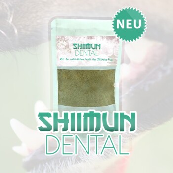 Shiimun Dental: zuverlässige Pflege für die Zähne Ihres Hundes Shiimun Dental ist eine natürliche Nahrungsergänzung für Hunde, mit der Sie die Zähne Ihres Vierbeiners auf unkomplizierte Weise reinigen und die Zahngesundheit unterstützen können. Was Shiimun Dental für Hunde so besonders macht Zahnerkrankungen sind bei Hunden keine Seltenheit und für die Vierbeiner oftmals mit starken Schmerzen verbunden. Es ist daher sehr wichtig, dass Sie der Zahnpflege bei Ihrem Hund genug Beachtung schenken. Mit Shiimun Dental haben wir mit unserem Expertenteam aus Tierärzten und Ernährungsberatern eine natürliche Lösung für die Zahnreinigung bei Hunden entwickelt. Die bekömmliche Nahrungsergänzung enthält ausgewählte Inhaltsstoffe wie Riementang und Shiitake, um der Bildung von Belägen und Zahnstein zuverlässig entgegenzuwirken. Riementang: Der zu den Braunalgen zählende Riementang fördert die Bildung spezieller Enzyme im Speichel. Diese helfen dabei, vorhandene Beläge von den Zähnen des Hundes zu entfernen und der Bildung von hartnäckigem Zahnstein entgegenzuwirken. Shiitake: Der Shiitake wird häufig auch König der Heilpilze genannt und insbesondere in Asien seit Langem sehr geschätzt. Er kann unter anderem auch einen wertvollen Beitrag zur Mundhygiene leisten. Eine 2011 in London durchgeführte Studie zeigte zum Beispiel, dass die Nutzung von Shiitake-Extrakt Bakterienbeläge im Mund in ähnlicher Weise wie eine antiseptische Mundspülung reduzieren kann. (1) Kamille und Salbei ergänzen die natürliche Zusammensetzung von Shiimun Dental für Hunde ideal und tragen entscheidend zur guten Wirksamkeit der Nahrungsergänzung für die Unterstützung der Gesundheit des Zahnfleischs und der Zähne bei. Warum Sie mit Shiimun Dental für die Zahnpflege bei Ihrem Hund richtig liegen Für ein gesundes Hundegebiss ist eine regelmäßige Reinigung der Zähne unerlässlich. Erfahrungsgemäß ist jedoch längst nicht jeder Vierbeiner davon begeistert, wenn sich sein Halter mit einer Zahnbürste in seinem Maul zu schaffen macht. Shiimun Dental ermöglicht es Ihnen, die Zähne Ihres Hundes zuverlässig zu reinigen, ohne dabei auf eine Zahnbürste und Hundezahnpasta zurückgreifen zu müssen. Das natürliche Nahrungsergänzungsmittel kann ganz einfach in etwas Wasser eingeweicht und unter das Futter des Vierbeiners gemischt werden. Dank seiner besonderen Zusammensetzung sorgt Shiimun Dental auf diese Weise ohne großen Zeitaufwand für eine wirkungsvolle Zahnreinigung. Die Inhaltsstoffe des gut bekömmlichen Präparats unterstützen die Gesundheit der Zähne und des Zahnfleischs und helfen gleichzeitig dabei, unangenehmem Mundgeruch bei Ihrem Hund entgegenzuwirken. Die wichtigsten Vorteile von Shiimun Dental im Überblick: Sehr bekömmlich dank natürlicher Inhaltsstoffe Ideal für die tägliche Zahnpflege beim Hund Unterstützt die Zahngesundheit Unterstützt die Gesundheit des Zahnfleischs Wirkt Mundgeruch beim Hund entgegen Einfache und zeitsparende Anwendung Keine Zahnbürste erforderlich Für Hunde aller Rassen und jeden Alters geeignet Die Shiimun Pilze stammen aus 100 % kontrollierter, biologischer Zucht. Diese Zutaten sind daher garantiert frei von jeglichen Zusatzstoffen wie Zucker, Fetten und erfüllen alle europäischen Anforderungen an Pestizide. Die Qualität unserer Produkte wird regelmäßig überprüft. (1) https://www.hindawi.com/journals/bmri/2012/217164/