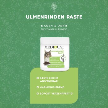 Die wohlriechende Medicat Ulmenrinden Paste unterstützt die Harmonisierung des Magen- und Darmtrakts von allen Katzen. Sie ist reich an basischen Mineralien, enthält wichtige Vitamine und natürliche Pflanzenstoffe. Diese rein natürlichen Prebiotika helfen dabei den Magen und Darm auf ganz natürliche Weise zu beruhigen. Dabei unterstützen die enthaltenen Ballaststoffe eine gute Darmfunktion. Die in der inneren Rinde der Ulme enthaltenen Schleimstoffe wie Flavonoide wirken zudem appetitanregend.Für deinen vierbeinigen Liebling ist nur das Beste gut genug. Wir haben uns als Premium-Hersteller auf hochwertige, sinnvolle und durchdachte Pflegeprodukte und Hundeernährung spezialisiert. Nur die höchste Qualität ist für uns gut genug. Unsere Rezepte werden nach neuesten wissenschaftlichen Erkenntnissen entwickelt um so das beste Produkt für deinen Liebling herstellen zu können.