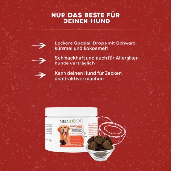 Unser effektiver Medidog Zeggi Weggi Snack ist ein besonders schmackhaftes Leckerli, das wir auf der Basis von gesundem Lammprotein komponiert haben. Der Zeggi Weggi Snack enthält keine künstliche Chemie.Der spezielle Snack aus rein pflanzlichen, funktionalen Ölen und Kräutern wurde extra schonend verarbeitet und ist natürlich getreidefrei. Die besonders soften Drops sind sehr lecker und versorgen deinen Vierbeiner mit vielen Nährstoffen. Die sorgsam ausgewählten Zutaten wie Kokos- und Schwarzkümmelöl können außerdem dazu beitragen, Ernährungsimbalanzen vorzubeugen. Die getreidefreien Drops sind hypoallergen und werden auch von empfindlichen Hunden sehr gut vertragen. Sie eignen sich für alle Altersstufen, vom Welpen bis zum Senior.