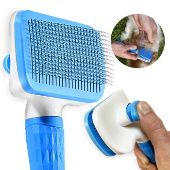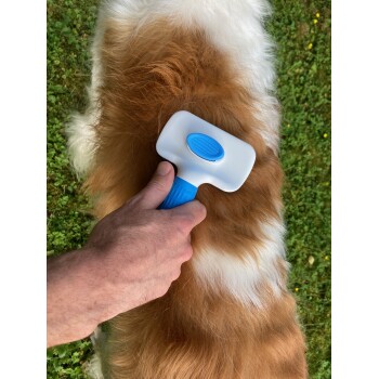 Diese tolle Fellbürste ist sowohl als Hundebürste die die Fellpflege von Hunden als auch als Katzenbürste für die Pflege von Katzenfell geeignet. Die Haustierbürste ist super stabil und dank ihrer 1-Klick-Funktion super leicht zu reinigen. Drücken Sie nach der Fellpflege einfach auf den Knopf auf der Rückseite der Bürste. Dadurch lassen sich ausgekämmte Hundehaare und Katzenhaare ganz leicht aus der Bürste entfernen. Die abgerundeten Zinken haben eine Ummantelung aus Kunststoff. Damit ist das Pflegeerlebnis für Ihren kleinen Liebling ganz besonders sanft, ohne zu kratzen.