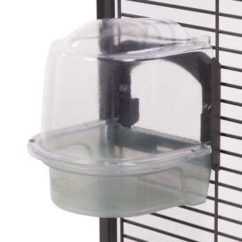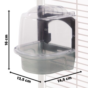 Auch Vögel lieben es, sich das Gefieder mit Wasser zu benetzen und ein schönes und erfrischendes Bad zu nehmen. Dieses Vogelbadehäuschen aus Kunststoff bietet Ihren gefiederten Freunden ein pflegeleichtes und komfortables Badevergnügen direkt an der Behausung. Die Grundschale des Badehäuschen ist aus hochwertigem Kunststoff gefertigt. Hier können Ihre Lieblinge sich bequem hinsetzen und in das Wasserbad beugen, um das Gefieder zu besprenkeln. Mutige Vögel finden auch einen Weg in die Wanne hinein und können sogar aufgrund der Größe des Badehäuschens ihr Gefieder sogar aufplustern. Damit kein Wasser in den Außenbereich gelangen kann ist das Badehäuschen komplett mit einer Haube versehen, welche vor Spritzern schützt. Das Häuschen ist transparent und bietet Ihnen somit eine schöne Beobachtungsmöglichkeit Ihrer Lieblinge. Als Hängevorrichtung sind am Häuschendach Haken angebracht. Bei Bedarf kann das Vogelbad auch problemlos auf dem Käfigboden abgestellt werden. Zugang: ca. 12 x 9,5 cm Gesamtgröße: ca. 14,5 x 13,5 x 16 cm Kompatibel mit folgenden Modellen: Madeira I Madeira II Madeira III Madeira Double Madeira Single Denver II Brazil Havana San Remo II San Remo III Geeignet für: - alle Finken und Sittiche (u.a. Wellensittich, Nymphensittich, Ziegensittich, Kanarien, Prachtrosella, australische und südamerikanische Sittiche, Unzertrennliche, Sperlingspapageien, Zitronensittiche, Agaporniden, wie z.B. Rußköpfchen, Erdbeerköpfchen und Rosenköpfchen, Mohrenkopfpapageien, Meyers Papageien, Grünzügel, Roßkappen, Pionus und alle anderen Sitticharten und kleinen Papageienarten)