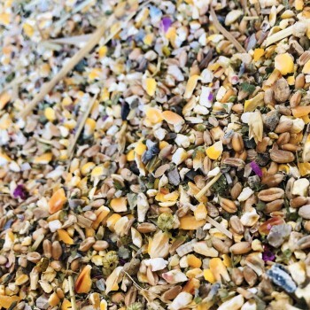 Das Lebensfreude Bio-Hühnerfutter von My Little Farm ist ein schmackhafter Mix aus hochwertigem Bio-Vollkorngetreide und wertvollen Bio-Kräutern für Legehennen undalle anderen Geflügeltiere.Die ausgewogene Futtermischung ist besonders auf die Unterstützung des Immunsystems ausgelegt, versorgt die Henne mit allen benötigten Nährstoffen und unterstützt eine optimale Legeleistung.Die enthaltenen Maisflocken liefern natürliche Carotinoide für goldgelbe Eidotter und Sonnenblumenkerne versorgen die Tiere mit wichtigen Spurenelementen und essenziellen Fettsäuren. Zusätzlich kann der Muschelschrot im Lebensfreude Bio-Hühnerfutter eine harmonische Verdauung unterstützen und für stabile und gute Eierschalen sorgen.Durch die Zugabe einer natürlichen Kräutermischung aus Bio-Majoran, Bio-Brennnessel, Bio-Salbei, Bio-Thymian, Bio-Rosenblüten, Bio-Lavendelblüten, Bio-Kamillenblüten und Bio-Oregano kann das Immunsystem durch deren antibakteriell und antiparasitär wirkenden Inhaltsstoffe ideal unterstützt werden. Die fermentierte Topinambur kann die Darmflora und die Verdauung des Huhns positiv beeinflussen. Zudem ist das Futter bedarfsgerecht vitaminisiert und mineralisiert, sodass der Tagesbedarf der Tiere an Vitalstoffen bestens durch das Lebensfreude Bio-Hühnerfutter gedeckt wird.