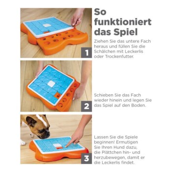 Es macht Spaß. Es enthält Futter. Es ist die Herausforderung, die Ihr Hund braucht! Die Leckerli-Denkspiele von Nina Ottosson bekämpfen Langeweile und tragen dazu bei, zerstörerisches Verhalten einzudämmen. Darüber hinaus geben sie Ihrem Hund die Möglichkeit, seine geistigen Fähigkeiten zu trainieren. Ein Versteckspiel mit Leckerlis - Hunde lieben es.Die Leckerli-Denkspiele von Nina Ottosson sind eine tolle Möglichkeit, Ihren Hund mit mentalen Herausforderungen zu beschäftigen, die auch noch Belohnungen beinhalten. Der Challenge Slider sorgt mit seinen 24 Leckerlifächern dafür, dass Ihr Hund beschäftigt bleibt. Die Hunde müssen jedes Plättchen einzeln verschieben, wodurch sie länger von dem Spiel gefesselt werden.