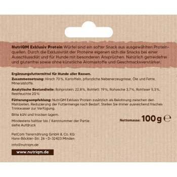 NutriQM Exklusiv Protein Würfel sind ein softer Snack aus ausgewählten Proteinquellen. Durch die Exklusivität der Proteine eigenen sich die Snacks bei einer Ausschlussdiät und für Hunde mit besonderen Ansprüchen.NutriQM Exklusiv Protein Hirsch enthält nur Hirsch als tierische Proteinquelle (Mono-Protein). Dadurch ist dieser Snack sehr bekömmlich und auch für ernährungssensible Hunde geeignet, die vielleicht Allergien gegenüber anderen tierischen Proteinen entwickelt haben.Natürlich getreide- und glutenfrei sowie ohne künstliche Aromastoffe und Geschmacksverstärker.