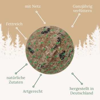 Füttern Sie die heimischen Wildvögel das ganze Jahr über mit den ORNI Meisenknödeln – einer nährstoffreichen und schmackhaften Futterlösung für Ihren Garten oder Balkon. Mit 100 Stück pro Packung und praktischem Netz sind diese Meisenknödel ideal zum Aufhängen und locken eine Vielzahl von Vögeln an.Produktmerkmale:Leckere Mischung: Jeder Meisenknödel enthält hochwertige Sonnenblumenkerne, die reich an Energie und Nährstoffen sind.Ganzjährig einsetzbar: Geeignet für Frühling, Sommer, Herbst und Winter, um Vögel in jeder Jahreszeit zu unterstützen.Praktisches Netz: Einfach aufzuhängen an Futterstellen, Bäumen oder Vogelhäusern – ideal für Garten, Balkon oder Terrasse.Fettfutter für Wildvögel: Liefert wichtige Energie und Nährstoffe, besonders in der kalten Jahreszeit, unterstützt aber auch die Ernährung im Sommer.Mengenpaket: Mit 100 Stück pro Packung sind Sie bestens versorgt und können Ihre gefiederten Freunde regelmäßig füttern.