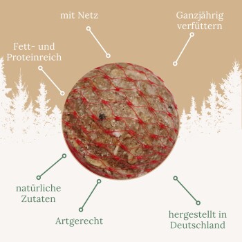 100 Stück leckere Meisenknödel mit InsektenDie Meisenknödel sind ein besonders schmackhaftes Vogelfutter und ideal geeignet zur Ganzjahresfütterung. Die Mischung ist fettreich mit vielen Sonnenblumenkernen, Erdnüssen, Samen, Früchten und leckeren Insekten. Eine wunderbare Mischung für Frühjahr, Sommer, Herbst und Winter!Die vielen Futterkomponenten ziehen zahlreiche heimische Vogelarten an. Schon nach kurzer Zeit und bei regelmäßiger Fütterung werden dich viele Vogelarten besuchen.Der Ideale Vogelfutterplatz?Die Meisenknödel können überall ganz einfach aufgehängt werden. Dabei ist zu beachten, dass sie hoch an einer übersichtlichen Stelle platziert werden, wo sie vor Katzen geschützt sind.