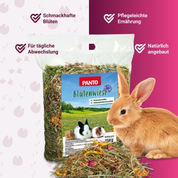 Unser PANTO Premium Heu Blütenwiese wächst auf den großen Marschwiesen entlang der Elbe. Schonend gedüngt, gemäht und verarbeitet ist es ein rohfaserreiches Grundfutter für alle Nager und Zwergkaninchen. Unterschiedliche Gräser und Kräuter bieten den Tieren mit vielen Ballaststoffen eine leckere und vor allem gesunde Ernährung. Gutes Heu ist die Basis einer gesunden Verdauung und fördert den Abrieb der immer nachwachsenden Zähne der Tiere. Dieses leckere Premium Heu wurde mit schmackhaften Blütenblättern von Kornblumen, Ringelblumen, Rosenblüten und Sonnenblumenblüten verfeinert. Ein besonderer Leckerbissen für die Tiere, da sie sich die Leckereien aus dem Heu heraussuchen müssen und somit eine Zeit mit ihrer Futtersuche beschäftigt sind. Es ist wichtig, Heu immer in ausreichender Menge zur freien Aufnahme anzubieten, damit die Verdauuung der Tiere nicht gestört wird durch zu lange Fresspausen.