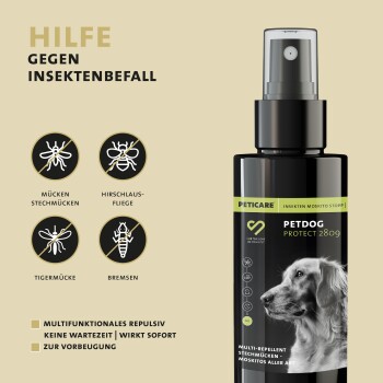 Peticare® petDog Protect 2809 Das Multi-Repellent für Hunde ist ein hochwirksames multifunktionales Premium-Produkt zur Abwehr von Mücken, Stechmücken, Insekten und Bremsen. Dieses Spezialprodukt wurde technologisch speziell auf den Schutz für Hund, Katze und allen anderen Kleintieren ausgelegt. Dieses komplexe Abwehrmittel wird auf biochemischer Basis durch den Organismus bzw. durch den Geruchssinn der Insekten, Mücken und Stechmücken wahrgenommen. Als Basiswirkstoffe werden ICARIDIN (hochwirksames Repellent) und ein spezieller biochemischer Botenstoff (Alarm-Pheromon) eingesetzt. Die multifunktionalen Wirkstoffe stoppen den Anflug von Stechmücken und Insekten beim Hund zuverlässig. Die hochwirksamen, zu 100 % hautfreundlichen Repulsiv-Wirkstoffe wehren Insekten, Mücken und Bremsen zuverlässig für bis zu 8 Stunden ab. Insekten, Mücken, Stechmücken, Tigermücken und Bremsen werden dadurch abgeschreckt und stoppen den Anflug. Peticare Release System Die multifunktionalen Wirkstoffe werden in eine winzige, poröse Struktur (Matrix) eingebettet. Die Kombination mit weiteren Bestandteilen erzeugt an der Oberfläche einen zusätzlichen diffusionsoffene Langzeitschutz. Durch diese technologische Aufbereitung entsteht ein innovatives Depot-/ und Retardpräparat. Die Wirkstoffe werden langsam und gleichmäßig über mehrere Stunden verteilt abgegeben. Die Wirkstoffe, die in der Matrix (Wirkstoffdepot) gebunden sind, werden durch das Peticare Release System langsam und gleichmäßig freigesetzt. Diese Retardierung (verzögerte Abgabe), in Verbindung mit dem Wirkstoffdepot macht Peticare Multi Repellent Moskito einzigartig und extrem effektiv. Produkteigenschaften schützt Hunde, Katzen und Kleintiere ergiebig und sparsam in der Anwendung Schutz für bis zu 8 Stunden Retard-/ Depotpräparat multifunktionale Repulsivstoffe (Repellent) hochwirksames "ICARIDIN" Präparat biochemische Alarm-Pheromone Wirkstoff von der WHO geprüft keine Wartezeit, sofortige Wirkung dermatologisch unbedenklich PRS Peticare Release System Bis zu 8 Stunden Schutzwirkung bei folgenden Parasiten Grasmilben (Neotrombicula autumnalis) Fliegen und Stechfliegen Tsetsefliegen (Glossina) Hirschlausfliegen (Lipoptena cervi) Stechmücken (Culex, Simulium) Aedes Mücke (verbreitet den Zika-Virus) Tigermücken (asiatische Tigermücke) Sandmücken (Phlebotominae) Malariamücken (Anopheles) Gelbfiebermücken (Aedesaegypti) Moskitos (Malariaerreger) Milben und Egel (z.B. Grasmilben) Die WHO (World Health Organization) hat den Wirkstoff ICARIDIN als hervorragend bewertet. Aus dem WHO Bericht frei übersetzt: unter gemäßigt, tropischen Bedingungen getestet ausgezeichnete insektenabwehrende Eigenschaft als wirksames Schutz zur Prävention empfohlen gutes Sicherheitsprofil gute kosmetische Eigenschaften kein signifikanter Einfluss auf gängige Materialien Funktionsweise des Multi-Repellent Im Gegensatz zu einem Insektizid werden Insekten bei Anwendung des Peticare petDog Protect 2809 (Multi-Repellent Moskito) nicht abgetötet. Das Repellent (lat. vertreiben) sorgt nach dem Auftragen für eine nachhaltige und gleichmäßige Verdampfung auf der Haut. Dadurch entsteht für den Zeitraum von bis zu 8 Stunden ein kontinuierlicher, nur wenige Millimeter dicker, Schutzmantel, der den Anflug von Insekten, Mücken, Stechmücken und Bremsen stoppt. Die olfaktorische Wahrnehmung (Geruchssinn) der anfliegenden Insekten wird gestört und das vermeintliche Opfer ist für Insekten und Stechmücken nicht mehr interessant.