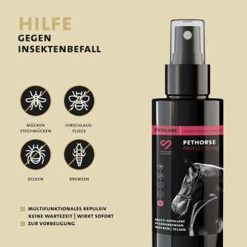 Peticare® petHorse Protect 2009 Das Multi-Repellent für Pferde ist ein hochwirksames multifunktionales Premium-Produkt zur Abwehr von Mücken, Stechmücken, Insekten und Bremsen. Dieses Spezialprodukt wurde technologisch speziell auf den Schutz für Pferd, Rind, Lama, Kamel und allen anderen Nutztiere ausgelegt. Dieses komplexe Abwehrmittel wird auf biochemischer Basis durch den Organismus bzw. durch den Geruchssinn der Insekten, Mücken und Stechmücken wahrgenommen. Als Basiswirkstoffe werden ICARIDIN (hochwirksames Repellent) und ein spezieller biochemischer Botenstoff (Alarm-Pheromon) eingesetzt. Die multifunktionalen Wirkstoffe stoppen den Anflug von Stechmücken und Insekten beim Pferd zuverlässig. Die hochwirksamen, zu 100 % hautfreundlichen Repulsiv-Wirkstoffe wehren Insekten, Mücken und Bremsen zuverlässig für bis zu 8 Stunden ab. Insekten, Mücken, Stechmücken, Tigermücken und Bremsen werden dadurch abgeschreckt und stoppen den Anflug. Peticare Release System Die multifunktionalen Wirkstoffe werden in eine winzige, poröse Struktur (Matrix) eingebettet. Die Kombination mit weiteren Bestandteilen erzeugt an der Oberfläche einen zusätzlichen diffusionsoffene Langzeitschutz. Durch diese technologische Aufbereitung entsteht ein innovatives Depot-/ und Retardpräparat. Die Wirkstoffe werden langsam und gleichmäßig über mehrere Stunden verteilt abgegeben. Die Wirkstoffe, die in der Matrix (Wirkstoffdepot) gebunden sind, werden durch das Peticare Release System langsam und gleichmäßig freigesetzt. Diese Retardierung (verzögerte Abgabe), in Verbindung mit dem Wirkstoffdepot macht Peticare Multi Repellent Moskito einzigartig und extrem effektiv. Produkteigenschaften schützt Pferde, Rinder und Nutztiere ergiebig und sparsam in der Anwendung Schutz für bis zu 8 Stunden (gegen Zecken bis 4 Stunden) Retard-/ Depotpräparat multifunktionale Repulsivstoffe (Repellent) hochwirksames "ICARIDIN" Präparat biochemische Alarm-Pheromone Wirkstoff von der WHO geprüft keine Wartezeit, sofortige Wirkung dermatologisch unbedenklich PRS Peticare Release System Bis zu 8 Stunden Schutzwirkung bei folgenden Parasiten Grasmilben (Neotrombicula autumnalis) Bremsen und Pferdebremsen Fliegen und Stechfliegen Tsetsefliegen (Glossina) Hirschlausfliegen (Lipoptena cervi) Stechmücken (Culex, Simulium) Aedes Mücke (verbreitet den Zika-Virus) Tigermücken (asiatische Tigermücke) Sandmücken (Phlebotominae) Malariamücken (Anopheles) Gelbfiebermücken (Aedesaegypti) Moskitos (Malariaerreger) Milben und Egel (z.B. Grasmilben) Die WHO (World Health Organization) hat den Wirkstoff ICARIDIN als hervorragend bewertet. Aus dem WHO Bericht frei übersetzt: unter gemäßigt, tropischen Bedingungen getestet ausgezeichnete insektenabwehrende Eigenschaft als wirksames Schutz zur Prävention empfohlen gutes Sicherheitsprofil gute kosmetische Eigenschaften kein signifikanter Einfluss auf gängige Materialien ADMR-konform Gemäß den Anti-Doping- und Medikamentenkontrollregeln der Deutschen Reiterlichen Vereinigung (FN) ist die Anwendung dieses Produktes im Wettkampf erlaubt (ADMR-konform). Funktionsweise des Multi-Repellent Im Gegensatz zu einem Insektizid werden Insekten bei Anwendung des Peticare petHorse Protect 2009 (Multi-Repellent Moskito) nicht abgetötet. Das Repellent (lat. vertreiben) sorgt nach dem Auftragen für eine nachhaltige und gleichmäßige Verdampfung auf der Haut. Dadurch entsteht für den Zeitraum von bis zu 8 Stunden ein kontinuierlicher, nur wenige Millimeter dicker, Schutzmantel, der den Anflug von Insekten, Mücken, Stechmücken und Bremsen stoppt. Die olfaktorische Wahrnehmung (Geruchssinn) der anfliegenden Insekten und der Zecken wird gestört und das vermeintliche Opfer ist für Insekten und Stechmücken nicht mehr interessant.