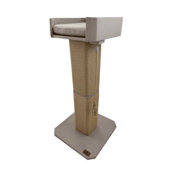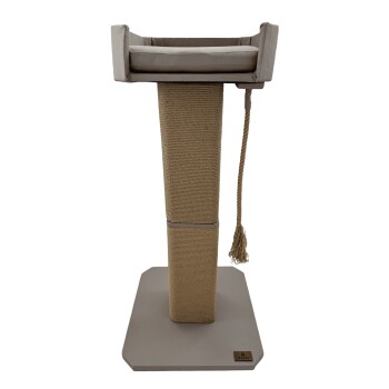 Dieser elegante Kratzbaum vereint modernes Design mit nachhaltiger Herstellung und durchdachter Funktionalität. Mit einer Gesamthöhe von ca. 120 cm, einer stabilen Bodenplatte (58 x 58 x 4 cm) und einem extra robusten Stamm (Durchmesser 20 cm) bietet er deiner Katze nicht nur einen gemütlichen Rückzugsort, sondern auch ausreichend Platz zum Kratzen, Spielen und Entspannen.Der Stamm ist mit natürlichem Sisal umwickelt – ideal für die Krallenpflege – und an der oberen Platte sorgt ein dickes Spielseil für zusätzlichen Spaß. Der Stoff besteht aus 100 % Baumwolle (Ökotex Standard 100 zertifiziert), ist pflegeleicht und wasserabweisend. Das Kissen ist abnehmbar und kann bei 30 °C in der Maschine gewaschen werden.Besonders bemerkenswert: Der Kratzbaum wird in liebevoller Handarbeit gefertigt und verwendet Holzreste aus der Möbelproduktion, was ihn nicht nur langlebig, sondern auch nachhaltig macht. Die Kombination aus hochwertigen Materialien, solider Bauweise und modernem Look macht ihn zu einem echten Highlight in jedem Zuhause.Maße• Grundfläche: ca. 58 x 58 cm• Gesamthöhe: ca. 120 cm• Stamm: 100 x 20 cm (2-teilig)• Obere Plattform: ca. 42 x 44 cm