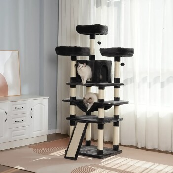 [Für Haushalte mit mehreren Katzen] Mit 3 Plattformen und einer gemütlichen Katzenhöhle bietet dieser Kratzbaum mehrere behagliche Plätze, an denen sich deine pelzigen Freunde entspannen und die Aussicht genießen können.[Weiche, bequeme Hängematte] Deine Katzen werden es darauf warm und kuschelig haben. Diese Hängematte wird schnell zum neuen Lieblingsplatz für Kuschelstunden![Einfacher Aufbau] Dank einfacher Konstruktion, universellen Schrauben und mitgeliefertem Inbusschlüssel kann dieser Katzenbaum von nur einer Person montiert werden.[2 Plüschbälle] 2 hängende Plüschbälle mit Glöckchen animieren deine Katze zum Strecken, Schlagen und Spielen für endlosen Spaß. Außerdem werden zwei Ersatz-Plüschbälle ohne Glöckchen für eine ruhigere Umgebung bereitgestellt.[Klettern leicht gemacht] Dank der treppenähnlichen Anordnung und Kletterplattformen können sowohl Kätzchen als auch ältere Katzen mit Leichtigkeit hinauf- und hinunterklettern.[Leicht zu reinigen] Haare, Schmutz und Krümel sind kein Problem. Sie lassen sich leicht mit einer Fusselrolle oder einem Staubsauger reinigen.