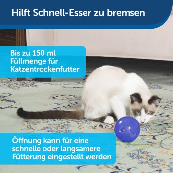 Sie können die Größe der Öffnungen einstellen. Dadurch steuern Sie, wie viel Futter während des Spiels herausfällt. Indem Sie Ihrer Katze den Tag über kleinere Portionen füttern, können Sie ihr Gewicht kontrollieren und gleichzeitig ihre Verdauung fördern. PetSafe trägt dazu bei, dass Ihr Haustier gesund, sicher und zufrieden ist. FÜR ALLE ALTERSGRUPPEN GEEIGNET: Dieses Katzenspielzeug spornt Ihre Katze oder Kätzchen zur aktiven Betätigung an. Gleichzeitig wird die Verdauung angekurbelt, was die Gesundheit fördert EINFACHE VERWENDUNG: Dank der verstellbaren Öffnungen eignet sich der Futterspender-Ball für viele verschiedene Futtergrößen. Zusätzlich können Sie die Fütterungsgeschwindigkeit kontrollieren VIELSEITIGE VERWENDUNG: Der Snackball hat eine Füllmenge von 150 ml. Diese ermöglicht es, eine anpassbare Menge an Trockenfutter, Nahrungsergänzungsmittel oder Leckerlis an Ihre Katze zu füttern UNTERHALTUNG: Durch den SlimCat werden die natürlichen Instinkte Ihrer Katze belebt. Auf diese Weise wird sie von unerwünschtem Verhalten abgehalten und mit den Snacks belohnt EINFACHE REINIGUNG: Der PetSafe Futterball ist für das obere Fach der Spülmaschine geeignet und kann ebenfalls mit warmem Wasser und Spülmittel gesäubert werden