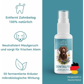 𝗣𝗥𝗢𝗕𝗜𝗢𝗧𝗜𝗦𝗖𝗛𝗘 𝗠𝗜𝗞𝗥𝗢𝗢𝗥𝗚𝗔𝗡𝗜𝗦𝗠𝗘𝗡: Das Dentalspray für Hunde und Katzen von Pfotenkumpels nutzt probiotische Mikroorganismen aus einer langjährigen Fermentation aus über 50 verschiedenen Kräutern, um Zahnstein und Zahnbelag effektiv zu bekämpfen. 𝗚𝗘𝗚𝗘𝗡 𝗭𝗔𝗛𝗡𝗕𝗘𝗟𝗔𝗚: Probiotische Mikroorganismen lösen langsam bestehenden Zahnbelag auf, beugen Neubildung effektiv vor, neutralisieren unangenehmen Maulgeruch und pflegen das Zahnfleisch durch eine gesunde Maulflora. 𝗢𝗛𝗡𝗘 𝗦𝗧𝗥𝗘𝗦𝗦: Das Zahnspray macht die tägliche Zahnpflege zum Kinderspiel – einfach täglich ins Maul oder auf das Futter sprühen. Ohne Quälerei mit Zahnbürste und -paste. Selbst bei Hunden und Katzen, die Zahnhygiene normalerweise ablehnen. 𝟭𝟬𝟬% 𝗡𝗔𝗧Ü𝗥𝗟𝗜𝗖𝗛: Mikroorganismen, fermentierte Kräuter, Minze und Kalzium für gesunde Zähne, Zahnfleisch und Maulflora. Ohne Chemie, Aromen, Alkohol und Zucker. Entwickelt und hergestellt in Deutschland. 𝗔𝗨𝗦 𝗘𝗥𝗙𝗔𝗛𝗥𝗨𝗡𝗚: Über 80% der Hunde- und Katzenbesitzer sind von Zahnproblemen betroffen. Pfotenkumpels auch! Deshalb hat Pfotenkumpels ein Spray entwickelt, das effektiv gegen Zahnstein kämpft und für frischen Atem sorgt – einfach, natürlich, ohne Stress für dich und deinen Pfotenkumpel.