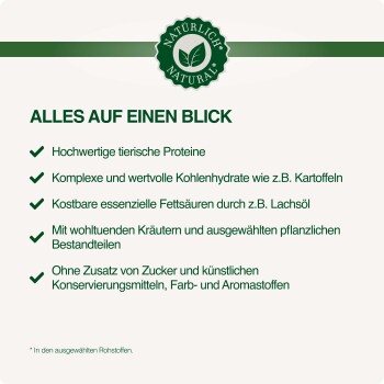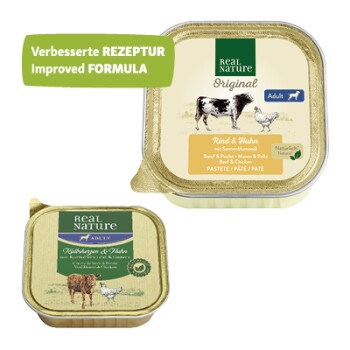 Die hochqualitative Vollnahrung enthält ein, zwei oder maximal drei verschiedene tierische Proteinquellen, hochwertigste pflanzliche Komponenten wie Kartoffeln oder Vollkornnudeln und wertvolle Öle, deren essenzielle Omega-6-Fettsäuren zur Haut- und Fellgesundheit beitragen können. Besonderheiten Geeignet für ausgewachsene Hunde ab dem 9. bzw. 25. Lebensmonat bis zum 6. bzw. 8. Lebensjahr, je nach Rasse und Größe. Schonende Zubereitung Die REAL NATURE Nassnahrung wird durch das Verfahren der Kaltabfüllung hergestellt. Das heißt: Die Zutaten werden kalt in die Dose abgefüllt und nur einmal erhitzt. Durch dieses einmalige Erhitzen bleiben die Nährstoffe der erlesenen Ingredienzien weitgehend erhalten. Feinste Zutaten aus der Natur Die hochqualitative Vollnahrung enthält ein, zwei oder maximal drei verschiedene tierische Proteinquellen, hochwertigste pflanzliche Komponenten wie Kartoffeln oder Vollkornnudeln und wertvolle Öle, deren essenziellen Omega-6-Fettsäuren zur Haut- und Fellgesundheit beitragen können. REAL NATURE Alleinfuttermittel ist durch Kaltabfüllung besonders schonend verarbeitet, enthält kein Tier- und Knochenmehl und keine künstlichen Zusatz- und Konservierungsstoffe. Ehrliche Deklaration Was drin ist, steht auch drauf! REAL NATURE gibt das Beste aus der Natur weiter. Alle Zutaten werden gewissenhaft ausgewählt, um den höchsten Qualitätsanforderungen gerecht zu werden. Die Vorteile im Überblick: 100% natürlich1: Zutaten höchster Qualität, keine Zusatzstoffe wie Zucker, Farbstoffe, Aromastoffe oder Konservierungsmittel. Schutz der natürlichen Nährwerte ohne Tier- und Knochenmehl 1 in den eingesetzten Rohstoffen *Schmeckt nicht? Mit unserer Akzeptanzgarantie bekommst du dein Geld zurück und suchst dir einfach ein anderes Futter aus.