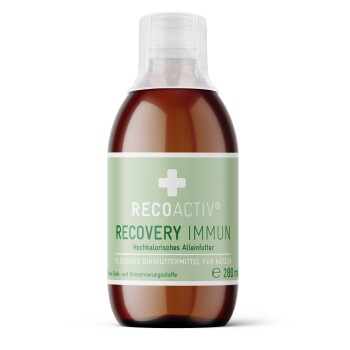 RECOACTIV® Recovery Immun ist ein wohlschmeckendes, hochkalorisches Futtermittel für schlecht fressende und geschwächte Katzen mit sehr hohem Energiebedarf infolge von Krankheiten oder Operationen. Untergewicht und schlechter Allgemeinzustand sind meist Folge einer unzureichenden Nahrungsaufnahme. Besonders häufig betroffen sind chronisch kranke und alte Tiere, die aufgrund von Appetitlosigkeit schlecht fressen, sowie Tiere mit Zahn-, Maul- und Rachenproblemen, die Schmerzen bei der Aufnahme von festem Futter leiden. Bei der hepatischen Lipidose ist die Nahrungsaufnahme eine Voraussetzung für die Genesung. Durch die hohe Akzeptanz, kombiniert mit hoher Energiedichte, unterstützt RECOACTIV® Recovery Immun wesentlich die Gewichtszunahme der mangelernährten Katze. Das Tonicum ist sehr gut verträglich und wird durch die flüssige Darreichungsform gut resorbiert. Es fördert den Appetit und damit die Nahrungsaufnahme bei Krankheiten und in der Rekonvaleszenz sowie bei allgemeiner Appetitlosigkeit und Nahrungsverweigerung. RECOACTIV® stärkt und versorgt das Tier auf diese Weise mit wichtigen Vitalstoffen, beugt Mangelerscheinungen vor und leistet einen wichtigen Beitrag zur Vorsorge und während der Behandlung Ihrer Katze. RECOACTIV® Recovery Immun kann als Alleinfutter verabreicht werden und in akuten Phasen den Energie- und Nährstoffbedarf des Tieres vollständig abdecken. RECOACTIV® Produkte enthalten wichtige Vitamine und Spurenelemente und bestehen aus natürlichen Inhaltsstoffen in Lebensmittelqualität. Sie sind frei von Getreide, Zucker, Farb- und Konservierungsstoffen. *In Zusammenarbeit mit dem Institut für Tierernährung der freien Universität Berlin, Fachbereich Veterinärmedizin, wurde in einer wissenschaftlichen Studie nachgewiesen, dass RECOACTIV® sowohl die Aufnahme von Wasser fördert als auch signifikant den Appetit von Katzen stimuliert und eine erhöhte Nahrungsaufnahme bewirkt.