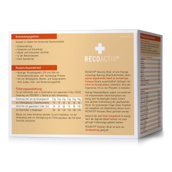 RECOACTIV® Recovery Renal ist ein wohlschmeckendes, hochkalorisches Futtermittel für schlecht fressende und geschwächte Katzen mit eingeschränkter Nierenfunktion bzw. chronischer Niereninsuffizienz. Durch die hochkalorische Rezeptur wirkt das Produkt Untergewicht und einem schlechten Allgemeinzustand entgegen, die meist Folge einer unzureichenden Nahrungsaufnahme und verändertem Stoffwechsel sind. An CNI erkrankte Katzen leiden an stark verändertem Geschmacksempfinden (Uringeschmack/Urämie), weshalb ein appetitanregendes Futtermittel von großer Bedeutung ist. Der intensive Geschmack/Geruch von RECOACTIV® Recovery Renal regt die Katze zur Futteraufnahme an. Durch die hohe Akzeptanz, kombiniert mit hoher Energiedichte bei gleichzeitig reduzierten Phosphatwerten, unterstützt RECOACTIV® Recovery Renal mit seiner flüssigen sehr schmackhaften Textur wesentlich die Gewichtszunahme der mangelernährten Katze. RECOACTIV® Recovery Renal kann als Alleinfutter verabreicht werden und in akuten Phasen den Energie- und Nährstoffbedarf des Tieres vollständig abdecken. Es ist auch als Sondennahrung geeignet. RECOACTIV® Produkte enthalten wichtige Vitamine und Spurenelemente und bestehen aus natürlichen Inhaltsstoffen in Lebensmittelqualität. Sie sind frei von Getreide, Zucker, Farb- und Konservierungsstoffen. *In Zusammenarbeit mit dem Institut für Tierernährung der freien Universität Berlin, Fachbereich Veterinärmedizin, wurde in einer wissenschaftlichen Studie nachgewiesen, dass RECOACTIV® sowohl die Aufnahme von Wasser fördert als auch signifikant den Appetit von Katzen stimuliert und eine erhöhte Nahrungsaufnahme bewirkt.
