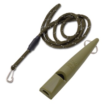 Mit dem ROMNEYS Bundle aus Pfeifenband Flash und ACME Hundepfeife No. 210.5 bist du bestens vorbereitet – egal ob beim täglichen Spaziergang, im Training oder bei schlechten Lichtverhältnissen. Die Hundepfeife erzeugt ein klares, lautes und frequenzstabiles Signal , das dein Hund zuverlässig erkennt und eindeutig zuordnet. Die ACME Hundepfeife No. 210.5 steht für gleichbleibende Qualität. Dank standardisierter Tonhöhe klingt jede Pfeife dieses Modells identisch – heute und auch noch nach Jahren. Selbst bei starkem Wind, Regen oder lauten Umgebungsgeräuschen bleibt das Signal konstant. Der höhere Pfeifton eignet sich besonders gut für klare Distanzsignale im Training. Das reflektierende Pfeifenband Flash ergänzt die Pfeife perfekt. Die 4 mm starke Reepschnur ist robust und langlebig, während der eingearbeitete Reflektorstreifen Licht zuverlässig zurückwirft. So wirst du bei Dämmerung besser gesehen und findest deine Pfeife sofort wieder. Über den stabilen Karabiner trägst du sie sicher und bequem um den Hals. Ob im Wald, auf freiem Feld oder in der Stadt – dieses Bundle verbindet Sicherheit, Funktionalität und Komfort . Erhältlich in Orange, Olive oder Schwarz mit Reflektorstreifen ist es ein zuverlässiger Begleiter für jeden Hundehalter.