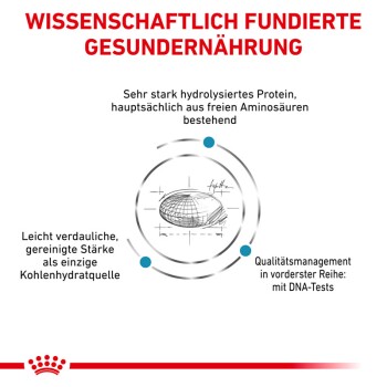 ROYAL CANIN® Anallergenic für die Bestimmung und das Management von Nährstoffintoleranzen und Futtermittelunverträglichkeiten bei Ihrem Hund durch den verringerten Kontakt mit Allergenen.ROYAL CANIN® Anallergenic ist eine ausgewogene und nährstoffreiche Rezeptur, die speziell dazu entwickelt wurde, ausgewachsenen Hunden mit Nährstoffintoleranzen und Futtermittelunverträglichkeiten zu helfen. Sehr stark hydrolysiertes Protein Diese Rezeptur enthält sehr stark hydrolysiertes Protein in Form von sehr kleinen Peptiden sowie freie Aminosäuren. So wird das Risiko von Nahrungsmittelunverträglichkeitsreaktionen reduziert. Allergenreduziert Die Rezeptur und der Herstellungsprozess dieser Nahrung sind auf Vermeidung eines Kontaktes mit potenziellen Nahrungsallergenen ausgerichtet. Dies zeigt sich unter anderem im Qualitätsmanagement durch DNA-Tests. Hautbarriere Diese Rezeptur enthält eine Kombination aus ausgewählten Nährstoffen, die die natürliche Barrierefunktion der Haut und somit ihre Gesundheit unterstützen. Antioxidanzienkomplex Die Nahrung enthält eine synergistische Antioxidanzienkombination, die zur Neutralisierung freier Radikale beiträgt und das Gewebe sowie die Zellen Ihres Hundes unterstützt. Wichtige Anmerkung Bei diesem Produkt handelt es sich um eine tierärztliche Nahrung aus dem Sortiment Veterinary Health Nutrition von ROYAL CANIN®. Dementsprechend ist es wichtig, dass das Futter nur auf Empfehlung einer Tierärztin oder eines Tierarztes gefüttert wird. So kann sichergestellt werden, dass Ihr Tier genau die Nahrung erhält, die es wirklich benötigt. Eine Nahrungsumstellung sollte sorgfältig und schrittweise über einen Zeitraum von 7–10 Tagen erfolgen. Achten Sie auf die korrekte Portionsgröße.