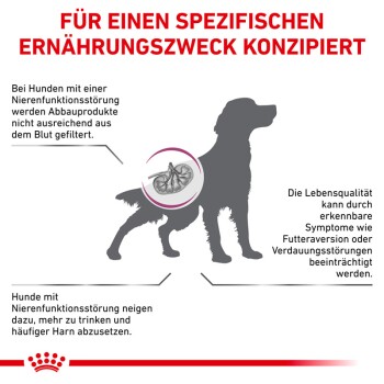 ROYAL CANIN® Renal zur Unterstützung der Nierenfunktion Ihres Hundes ROYAL CANIN® Renal ist eine ausgewogene und nährstoffreiche Rezeptur, die speziell dazu entwickelt wurde, die Nieren Ihres Hundes bei einer Nierenfunktionsschwäche zu unterstützen. Unterstützung der Nierenfunktion Dieses Futter enthält einen niedrigen Phosphorgehalt und einen moderaten Anteil hochwertiger Proteine, um die Nierenfunktion zu unterstützen. Angepasster Energiegehalt Der angepasste Energiegehalt der Rezeptur ermöglicht kleinere Portionsgrößen pro Mahlzeit, wodurch ein verringerter Appetit bei einigen Hunden kompensiert werden kann. Aromatische Auswahl Diese Nahrung zeichnet sich durch ein spezifisches Aromaprofil aus, um den Appetit Ihres Hundes anzuregen – insbesondere, wenn das Fressen verweigert wird. Die spezielle Form (quadratisch), Größe und Konsistenz der Kroketten haben einen zusätzlichen stimulierenden Effekt. Wichtige Anmerkung Bei diesem Produkt handelt es sich um eine tierärztliche Nahrung aus dem Sortiment Veterinary Health Nutrition von ROYAL CANIN®. Dementsprechend ist es wichtig, dass das Futter nur auf Empfehlung einer Tierärztin oder eines Tierarztes gefüttert wird. So kann sichergestellt werden, dass Ihr Tier genau die Nahrung erhält, die es wirklich benötigt. Eine Nahrungsumstellung sollte sorgfältig und schrittweise über einen Zeitraum von 7–10 Tagen erfolgen. Achten Sie auf die korrekte Portionsgröße – insbesondere bei Mischfütterung. Mischfütterung möglich Um den individuellen Vorlieben aller Hunde gerecht zu werden, ist ROYAL CANIN® Renal auch als Feuchtnahrung mit feinen Stückchen in Soße oder mit einer weichen Mousse-Textur sowie als Renal Special und Renal Select Kroketten in verschiedenen Formen, Konsistenzen und Aromen erhältlich.* Mischfütterung verleiht der Nahrung unterschiedliche Konsistenzen, was den Appetit anregen kann. Feuchtnahrung hat ein intensiveres Aroma und ihr Feuchtigkeitsgehalt hilft dabei, den Wasserhaushalt des Tieres zu regulieren. Trockennahrung hingegen ist einfacher aufzunehmen und gut für die Zähne. *Abhängig von der Produktverfügbarkeit