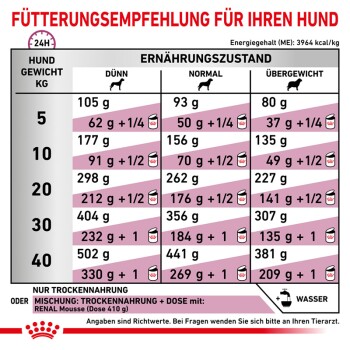 ROYAL CANIN® Renal Select zur Unterstützung der Nierenfunktion Ihres Hundes ROYAL CANIN® Renal Select ist eine ausgewogene und nährstoffreiche Rezeptur, die speziell dazu entwickelt wurde, die Nieren Ihres Hundes bei einer Nierenfunktionsschwäche zu unterstützen. Unterstützung der Nierenfunktion Dieses Futter enthält einen niedrigen Phosphorgehalt und einen moderaten Anteil hochwertiger Proteine, um die Nierenfunktion zu unterstützen. Angepasster Energiegehalt Der angepasste Energiegehalt der Rezeptur ermöglicht kleinere Portionsgrößen pro Mahlzeit, wodurch ein verringerter Appetit bei einigen Hunden kompensiert werden kann. Aromatische Auswahl Diese Nahrung zeichnet sich durch ein spezifisches Aromaprofil aus, um den Appetit Ihres Hundes anzuregen – insbesondere, wenn das Fressen verweigert wird. Die spezielle Halbmondform, Größe und Konsistenz der Kroketten haben einen zusätzlichen stimulierenden Effekt. Wichtige Anmerkung Bei diesem Produkt handelt es sich um eine tierärztliche Nahrung aus dem Sortiment Veterinary Health Nutrition von ROYAL CANIN®. Dementsprechend ist es wichtig, dass das Futter nur auf Empfehlung einer Tierärztin oder eines Tierarztes gefüttert wird. So kann sichergestellt werden, dass Ihr Tier genau die Nahrung erhält, die es wirklich benötigt. Eine Nahrungsumstellung sollte sorgfältig und schrittweise über einen Zeitraum von 7–10 Tagen erfolgen. Achten Sie auf die korrekte Portionsgröße – insbesondere bei Mischfütterung. Mischfütterung möglich Um den individuellen Vorlieben aller Hunde gerecht zu werden, ist ROYAL CANIN® Renal Select auch als Feuchtnahrung mit feinen Stückchen in Soße oder mit einer weichen Mousse-Textur sowie als Renal und Renal Special Trockennahrung mit Kroketten in verschiedenen Formen, Konsistenzen und Aromaprofilen erhältlich.* Mischfütterung verleiht der Nahrung unterschiedliche Konsistenzen, was den Appetit anregen kann. Feuchtnahrung hat ein intensiveres Aroma und ihr Feuchtigkeitsgehalt hilft dabei, den Wasserhaushalt des Tieres zu regulieren. Trockennahrung hingegen ist einfacher aufzunehmen und gut für die Zähne. *Abhängig von der Produktverfügbarkeit