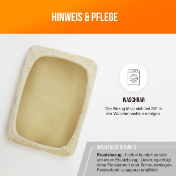 Ersatzbezug für die Fensterbankliege PRAKTISCH - Der Bezug deiner Fensterbankliege ist verschmutzt oder defekt? Zeit für einen Ersatzbezug! Das Beste daran: Du musst nicht das komplette Brett ersetzen! WASCHBAR - Der Bezug ist besonders pflegeleicht. Einfach mit einem feuchten Tuch abwischen oder absaugen. Bei starker Verschmutzung ist der Bezug bei 30°C waschbar. EINFACH ABZUBRINGEN - Dank Gummiband im Saum lässt sich der Ersatzbezug ganz leicht anbringen. Einfach spannen, drüber ziehen und fertig! FÜR VIELE MODELLE GEEIGNET - Der Ersatzbezug eignet sich nicht nur für unsere Fensterbankliege Teddy, sondern auch für viele handelsübliche Fensterliegen mit Maßen bis zu 51x36 cm. VERSCHIEDENE FARBEN - Der Bezug ist in verschiedenen Farben erhältlich. So kann die Fensterliege immer dem aktuellen Geschmack und Einrichtungsstil angepasst werden. Aus alt mach neu! Wenn der Bezug deiner Fensterbankliege kaputt oder stark verschmutzt ist, musst du ab jetzt nicht mehr das komplette Liegebrett ersetzen! Mit unseren Ersatzbezügen sieht deine Fensterliege in Sekundenschnelle wieder perfekt aus! Das schont nicht nur die Umwelt, sondern auch deinen Geldbeutel. Einfach den alten Bezug abziehen, den neuen Bezug aufziehen und schon hat deine Katze wieder einen schönen Schlafplatz. Du hast eine Fensterliege ohne abnehmbaren Bezug? Auch kein Problem. Unser Ersatzbezug kann einfach über den alten Bezug drüber gespannt werden. Unsere Ersatzbezüge passen auf die meisten handelsüblichen Modelle mit Maßen bis zu 51x36 cm. Wir empfehlen, immer mindestens einen Ersatzbezug im Haus zu haben, falls der andere einmal in der Wäsche ist. Unsere Bezüge sind nämlich bei 30°C waschbar und damit besonders pflegeleicht. Aber ACHTUNG : Der Bezug ist nicht trocknergeeignet. SCHLITZOHR steht für modernes Katzenzubehör ohne Verzicht auf Komfort. Auch unsere Ersatzbezüge sind in verschiedenen, modernen Farben erhältlich. So können sie immer dem aktuellen Einrichtungsstil angepasst werden. Mit der Zeit ändert sich auch manchmal der Geschmack, dann ist es gut, mehrere verschiedene Farben vorrätig zu haben. So können die Farben je nach Belieben gewechselt werden. Wir von SCHLITZOHR lieben Katzen! Durch unsere jahrelange Erfahrung mit Katzen wissen wir genau, was Stubentigern gefällt und wie man das Zusammenleben von Katzen und deren Haltern verbessern kann. Ganz nach unserem Motto „von Katzenfans - für Katzenfans“ entwickeln wir durchdachtes und langlebiges Katzenzubehör, welches vorher ausgiebig von unseren eigenen Katzen getestet wurde. Auf unsere SCHLITZOHR Qualität kannst du dich verlassen! Wir lieben aber nicht nur Katzen, sondern alle Tiere! Deshalb besteht unser Logo natürlich aus Kunstleder. HINWEIS: Keine Lieferung an Packstationen und Postfilialen möglich!