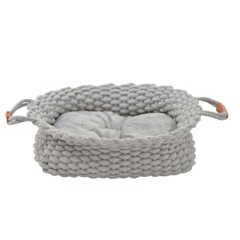 Das hier verwendete Textilgeflecht ist nicht nur extrem anschmiegsam sondern wirkt auch optisch besonders attraktiv. Für zusätzliche Bequemlichkeit sorgt das innenliegende Kissen, dass herausgenommen und per Hand gewaschen werden kann. Um auch kleineren Tieren den Einstieg zu erleichtern, kann der Rand ganz einfach heruntergeklappt werden. Die beiden Henkel sind mit braunem Kunstleder abgesetzt und runden das Ganze optisch ab. Material: Textilgeflecht: 50 % Polyester, 50 % Baumwolle, Kissenbezug: 100 % Polyester Kissenfüllung: 100 % Polyester