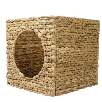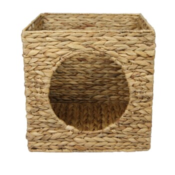 Die Kuschelbox Berry kann platzsparend in ein passendes Regalfach gestellt werden und harmoniert durch das natürliche Geflecht aus Wasserhyazinthe mit jedem Einrichtungsstil. Durch die Möglichkeit, den Boden aus der Höhle zu nehmen und die Seitenteile zusammen zu klappen, kann der gewohnte Schlafplatz auch auf Reisen mitgenommen werden. Die notwendige Stabilität erhält das anschmiegsame Wasserhyazinthen-Geflecht durch den eingearbeiten Metallrahmen. Oben ist die Höhle komplett offen und vorne ist zusätzlich ein runder Eingang (Ø ca. 17 cm) eingearbeitet. Gesamtmaß (LxBxH) ca.: 33x33x33 cmBestehend aus: 1 klappbare Kuschelbox
