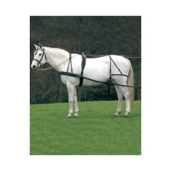 Das Einspänner Geschirr Economic von STAR ist eine robuste und praktische Lösung für alle Fahrbegeisterten, die Wert auf Qualität und Komfort legen.Dieses, aus Leder gefertigte, Brustblatt-Geschirr ist speziell für den anspruchsvollen Einsatz konzipiert, mit weicher Unterlegung für zusätzlichen Komfort deines Pferdes und nylonverstärkt für erhöhte Haltbarkeit und Festigkeit.Das Set ist komplett ausgestattet mit einem Fahrzaum inklusive Scheuklappen, Fahrleinen für die präzise Steuerung, einem Brustblatt, das den Zug komfortabel auf die Brust des Pferdes verteilt, sowie einem Selett, das für die optimale Verteilung der Zugkraft sorgt. Zugstränge, ein Schweifriemen und ein Hintergeschirr runden das Set ab und bieten eine umfassende Ausstattung für den Fahrsport.Die Tragösen am Bauchgurt sind beweglich, was eine flexible Anpassung und einen hohen Tragekomfort ermöglicht. Zusätzlich ist das Geschirr mit einer praktischen Geschirrtasche für den sicheren Transport und die ordentliche Aufbewahrung ausgestattet. Robustes Leder mit weicher Unterlegung und nylonverstärkt für Komfort und Haltbarkeit Komplettes Set inklusive Fahrzaum mit Scheuklappen, Fahrleinen und weiterem Zubehör Bewegliche Tragösen am Bauchgurt für optimale Anpassung und Komfort Inklusive Geschirrtasche für praktischen Transport und Aufbewahrung Ideal für den anspruchsvollen Einsatz im Fahrsport Einzelteil Größe (cm) Minishetty Shetty Pony Vollblut Warmblut Warmblut Extra Brustblatt (L x B) 80 x 11 90 x 11 100 x 11 125 x 13 135 x 13 145 x 13 Schweifriemen 162,5 175 192,5 215 227,5 242,5 Hintergeschirr 1 (Hüftgurt) 95 105 115 125 135 145 Hintergeschirr 2 (unteres Teil) 95 105 115 125 135 145 Zügel 640 660 740 840 900 940 Gurt 150 160 170 180 190 200 Bauchgurt 35 40 45 55 65 75 Zugstränge 150 160 170 195 205 215 Nackenstück 75 85 95 105 115 125 Stirnband 36,25 38,75 41,25 43,75 46,25 48,75 Nasenband 65 65 67,5 70 75 80 Backenstück 15 16 18 20 21 22 Kehlriemen 15 16 18 20 21 23 Kopfstück 52,5 55 57,5 62,5 65 70