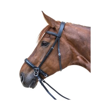Der Trensenzaum von STAR ist gebisslos und mit Wirkung eines Scawbrig (Wirkung über die Kinnlade). Am Nasen- und Genickriemen ist die Trense mit einer weichen Polsterung für ein angenehmes Tragegefühl ausgestattet. Dieser Zaum ist eine gute Abwechslung für Pferde, die bereits gut ausgebildet sind. Die willkommene Abwechslung zum Trensenzaum für gut ausgebildete Pferde.