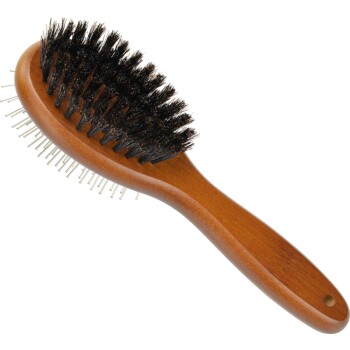 Diese vielseitige Bürste vereint zwei Pflegewerkzeuge in einem und ist besonders für das Kämmen der Unterwolle von Hunden zu empfehlen. Die abgerundeten Stahlpins lösen mühelos Knoten, Verfilzungen und entfernen abgestorbene Haare, ohne dabei lebende Haare auszureißen. Dabei bieten sie eine angenehme Massage, die dein Haustier lieben wird. Die andere Seite der Bürste, ausgestattet mit hochwertigen Naturhaarborsten, entfernt sanft Staub und verleiht dem Fell einen seidigen Glanz. Hergestellt aus nachhaltigem, FSC-zertifiziertem Bambus (FSC-C137259), ist diese Bürste nicht nur funktional, sondern auch umweltfreundlich. Sie pflegt das Fell deines Haustiers, stylt es und sorgt für ein gesundes und glänzendes Aussehen – alles in einem Schritt. Auf einen Blick: 2in1-Zupfbürste Stylen, Kämmen und Massage Geeignet für Knoten und Unterwolle FSC-zertifizierter Bambus (FSC-C137259) Material: Bambus, Stahl, Wildschweinborsten