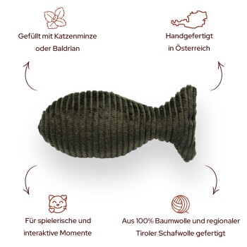 Dieser Fisch riecht zum Reinbeißen gut! Der frische und intensive Geruch von Katzenminze und Baldrian hat auf unsere Vierbeiner eine euphorisierende Wirkung. Die beiden Duftvarianten regen zum spielerischen Verhalten an. Katzen reiben sich daran, lecken das Kissen ab und wälzen sich darauf.Gefüllt mit Katzenminze oder BaldrianSehr robust & strapazierfähigAus natürlichen & regionalen MaterialienHandgemacht in ÖsterreichDie The Catery Duftkissen werden regional in Österreich handgefertigt und bestehen aus sehr hochwertigen & natürlichen Materialien. Der Baldrian sowie die Katzenminze werden im Gegensatz zu herkömmlichen Produkten in Europa angebaut. Wir befüllen unsere Duftkissen nur mit Bio-Produkten. Aus der Katzenminze und dem Baldrian kann ein Tee gemacht werden. Diese Wertigkeit erkennt man auch am Duft, auf welchen die Katzen sehr stark reagieren. Der Cordstoff wird in Europa hergestellt und ist zu 100 % Prozent aus Baumwolle. Gefüllt wird das Kissen mit natürlicher Berg- & Steinschafwolle aus den Tiroler Alpen. Beim Füllen der Minz- & Baldriankissen ist in der Wolle sogar das eine oder andere Blütenblatt bzw. Grashalm zu sehen.Die Gesundheit und das Wohlbefinden unserer Vierbeiner ist uns besonders wichtig, deshalb legen wir sehr viel Wert auf die Natürlichkeit und Herkunft unserer Produkte. Materialien:Der Stoff ist zu 100% aus Baumwolle.Gefüllt mit natürlicher Tiroler Berg- & Steinschafwolle aus Österreich, Stoffreste (damit durch den Zuschnitt kein Müll verursacht wird) und Katzenminze bzw. Baldrian, angebaut in Europa.Farbe: OlivgrünAbmessung: 15 x 7 cmMit Liebe und Bedacht für unsere Katzen gemacht.