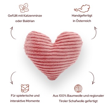 Seien wir uns doch mal ehrlich, gute Produkte für unsere Katzen ist doch für jeden von uns eine Herzensangelegenheit. Der frische und intensive Geruch von Katzenminze und Baldrian hat auf unsere Vierbeiner eine euphorisierende Wirkung. Die beiden Duftvarianten regen zum spielerischen Verhalten an. Katzen reiben sich daran, lecken das Kissen ab und wälzen sich darauf.Gefüllt mit Katzenminze oder BaldrianSehr robust & strapazierfähigAus natürlichen & regionalen MaterialienHandgemacht in ÖsterreichDie The Catery Duftkissen werden regional in Österreich handgefertigt und bestehen aus sehr hochwertigen Materialien. Der Cordstoff wurde mit Bedacht für unsere Minze- und Baldriankissen ausgewählt. Dieser ist sehr robust und hält auch wilderen Spieleinheiten stand. Außerdem besteht der Stoff zu 100% aus Biobaumwolle, er ist somit besonders nachhaltig und pfotenfreundlich für die Katzen. Die Gesundheit und das Wohlbefinden unserer Vierbeiner ist uns besonders wichtig, deshalb legen wir sehr viel Wert auf die Natürlichkeit und Herkunft unserer Produkte. Materialien:Der Stoff ist zu 100% aus Baumwolle.Gefüllt mit natürlicher Tiroler Berg- & Steinschafwolle aus Österreich, Stoffreste (damit durch den Zuschnitt kein Müll verursacht wird) und Katzenminze bzw. Baldrian, angebaut in Europa.Farbe: RosaAbmessung: 10 x 10 cmMit Liebe und Bedacht für unsere Katzen gemacht.