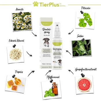 Natürliche Zahnreinigung & Zahnsteinentferner TIERPLUS ZAHNPFLEGE SPRAY: Natürliche Zahn- & Maulpflege für Ihren Hund mit ausgewählten Kräutern, Grapefruitkernextrakt & Propolis. Effektiv bei Plaque, Zahnstein & Mundgeruch. 100 ml Sprühflasche reicht für 600 Sprühstöße! EINFACHE ANWENDUNG : Bessere Alternative & Akzeptanz zu Zahnbürste, Zahnpasta & Zahnputzflocken. Einfach 1x am Tag ins Maul sprühen & fertig. Der angenehme Duft sorgt dafür, dass es von jeder Rasse & Größe angenommen wird 100% NATÜRLICHER INHALT: Unser Pulver enthält ausschließlich natürliche Inhaltsstoffe und ist frei von unnötigen Zusätzen & Konservierungsstoffen. Für unser Produkt verzichten gänzlich auf Tierversuche! DEUTSCHES QUALITÄTSPRODUKT: Höchste Qualität & strengste Kontrollen von der Auswahl der Rohstoffe bis hin zum Endprodukt. Unsere Produkte werden nach besten Qualitäts- & Sicherheitsstandards, TÜV, ISO-Konform zu 100% in Deutschland hergestellt