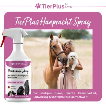 Haarpracht Spray für Pferde & Hunde, 500 ml Sprühflasche, Fell-, Schweif-, & Mähnenspray, Pflegespray für seidigen Glanz, leichte Kämmbarkeit & Entwirrung TIERPLUS HAARPRACHT SPRAY: Natürliche Inhaltsstoffe für eine perfekte Fell-, Schweif-, & Mähnenpflege bei Pferd & Hund. Ideal für die schnelle Pflege zwischendurch & perfekt als Shampoo Ersatz. 100% hautfreundlich mit Aloe Vera. KLEINES WUNDER GROßE WIRKUNG: Bereits wenige Sprühstöße sorgen für seidigen Glanz, leichteres Kämmen & knotenfreies Haar. Soforthilfe bei trockenem Haar, verklebtem Schweif & stumpfen Fell. Rundum Pflege von der Wurzel bis in die Spitzen! LEICHTE ANWENDUNG: Einfach aufsprühen, warten bis es antrocknet, ausbürsten & fertig! TierPlus Haarpracht Spray ist für jede Rasse und jedes Alter geeignet. Effektiv auch bei überstrapaziertem & stark verschmutztem Fell/ Haar! FÜR PFERD & HUND: TierPlus Juckreizspray ist sowohl für Pferde als auch für Hunde geeignet. Vorbei die Zeiten, wo Sie ein Präparat für jedes Tier brauchten. Sie brauchen nur noch ein Produkt für ihre liebsten Vierbeiner! DEUTSCHES QUALITÄTSPRODUKT: Wir garantieren höchste Qualität & strengste Kontrollen von der Auswahl der Rohstoffe bis hin zum Endprodukt. Nach besten Qualitätsstandards, TÜV und ISO-Konform, zu 100% in Deutschland hergestellt.