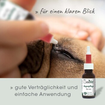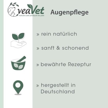 Pflegemittel für Tiere Gründliche und schonende Reinigung der Augenumgebung Für eine schonende und effektive Reinigung der Augenumgebung. VeaVet Augenpflege kann auch zur zusätzlichen Pflege bei Bindehautproblemen eingesetzt werden. Anwendungsempfehlung: Flasche in ausreichendem Abstand über das Auge halten und 1-2 Tropfen durch Drücken auf die Flaschentülle auf die zu reinigende Umgebung geben, eventuell sich lösenden Schmutz vorsichtig abwischen.