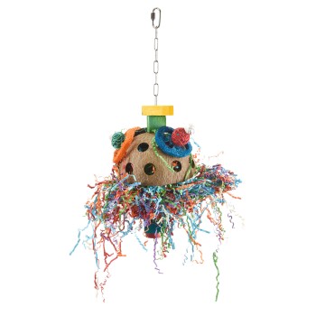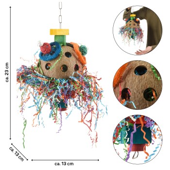 Unser "Sputnik" ist ein Schredderspielzeug für Großsittiche, mittlere & große Papageien Es besteht aus einer Kokosschale mit Löchern in welcher ein Schredderball befestigt wird. Der Ball ist gefüllt mit unserem ZIGZAG Schredderpapier und wird durch eine Edelstahlkette gehalten. Dieses ist mit buten Holzteilen verziert und als Aufhängung dient wie bei allen Spielzeugen ein Edelstahlverschluss. Die Kokosschale ist außerdem noch mit 3 bunten Schredderbällchen gespickt. Die Kokosschale kann nach Zerstören des Spielzeuges z.B. als Spielzeugkörbchen weiter verwendet werden. Größe (BxTxH): 13 x 13 x 23 cm Farbe: farblich sortiert Geeignet für Großsittiche sowie mittlere und große Papageien. QUALITÄTSHINWEIS: - alle Metallteile sind aus Edelstahl - alle Materialien sind ungiftig - Wagner's verwendet nur Lebensmittelfarben